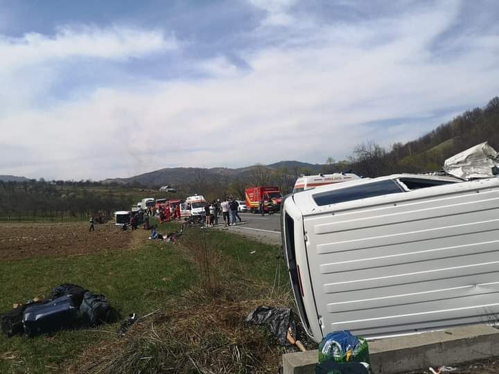 Carambol: Microbuz plin de elevi, răsturnat pe ruta Severin-Timișoara