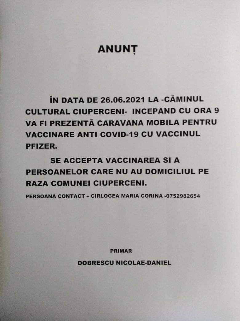Persoanele nevaccinate din comună Ciuperceni pot primi o doză de Pfizer daca, pe data de 26 iunie, vor trece pragul căminului cultural din localitate, de la ora 9.00 dimineața. Caravană mobilă de vaccinare ajunge in aceea zi în localitate, anunță primarul comunei Daniel Dobrescu.