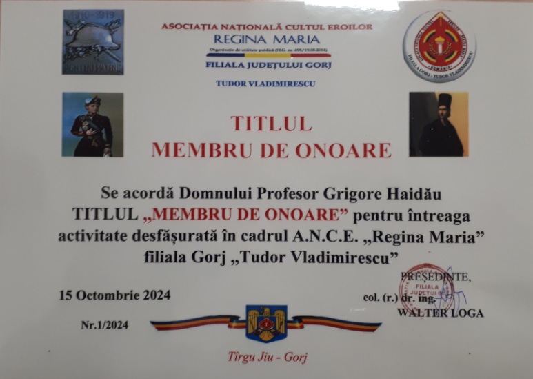 Cu acest prilej, col. (rtr.) dr. ing. Walter Loga – președintele Filialei Gorj Cultul Eroilor a acordat Titlul de Membru de Onoare al acestei filiale din care face parte încă din anul 2014, fiind și vicepreședinte mulți ani, pentru întreaga activitate desfășurată în cadrul filialei. „Să vă țină Dumnezeu sănătos mulți ani de acum înainte și inspirație la creație”, a spus colonelul Loga la înmânarea diplomei.