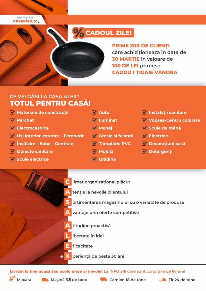 Primii 200 de clienți care achiziționează produse, în ziua deschiderii, în valoare de 100 lei vor primi gratuit o tigaie”, anunță Casa Alex Motru.