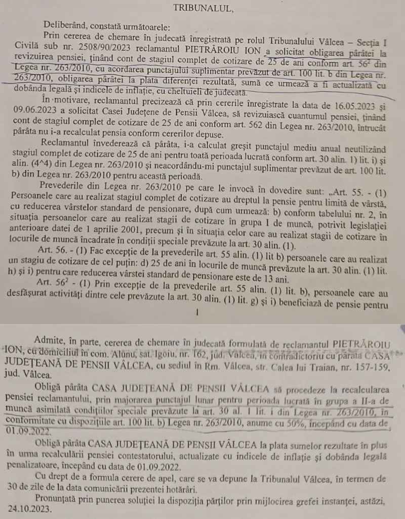 Încă un caz în care un salariat al CE Oltenia, acum pensionar, care a lucrat la cariera Berbești-Alunu, externalizată de CE Oltenia în 2015, a câștigat în instanță recalcularea pensiei.