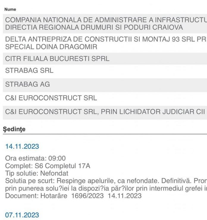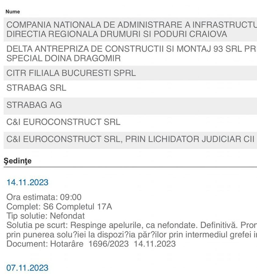„După 13 de la câștigarea contractului, timp în care nu s-a întâmplat nimic pe acest drum, nici măcar proiectul tehnic de execuție nu a fost întocmit, și după mai multe încercări de reziliere, astăzi DRDP Craiova a câștigat definitiv procesul ce permite rezilierea acestui contract. A fost un proces dificil, cu multe termene, dar juriștii noștri au reușit performanța de a învinge avocații constructorilor, avocați specializați în astfel de litigii.