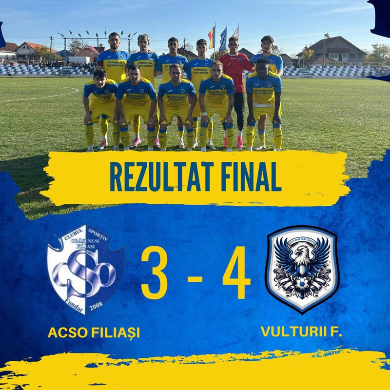Victorie mare pentru Vulturii Fărcășești în runda precedentă din Liga 3 la fotbal. Echipa pregătită de Cătălin Bucă s-a impus pe terenul formației de pe locul secund din Seria 8, ACSO Filiași, scor 3-4. A fost un adevărat thriller în Dolj. Gorjenii au avut 2-0, după dubla lui Alexandru Tărăbîc, dar au adormit pe final de repriză, când gazdele au marcat de trei ori. După ce au ieșit ,,scântei” din vestiarul vulturilor la pauză, oaspeții au egalat rapid prin Luis Scurtu, iar Robert Bubuioc a semnat reușita victoriei. Antrenorul Cătălin Bucă a declarat că formația sa putea să se impună chiar mai lejer, dar este foarte mulțumit de atitudinea arătată de gorjeni la acest meci. ,,Venim după un meci nebun, cu multe goluri înscrise și răsturnări de situație. În minutul 31 am făcut 2-0. Meciul decurgea exact cum ne doream noi. Dar au venit 5 minute fatidice pentru noi, din prima repriză, când efectiv ne-am blocat. Bine, și cu largul concurs al arbitrului, la golul doi, când s-a dat un penalti inexistent. Acolo s-a făcut 2-2 și imediat, la două minute, am mai avut o greșeală personală și au preluat conducerea la pauză. A urmat o ședință mai serioasă în vestiar la pauză. Băieții au înțeles, au revenit și am marcat în minutul 47. Eu cred că golul acela ne-a dat din nou avânt. Am trecut la conducerea jocului și în minutul 70 am înscris golul victoriei, având după încă două situații de a marca singur cu portarul. Una peste alta, sunt foarte mulțumit de cum au arătat băieții la meciul respectiv. Mi-a plăcut determinarea lor. Nu e ușor să faci remontada, cum se zice, când conduci, ești condusă și revii. Asta înseamnă că suntem o echipă bună, la acest moment. Băieții nu mi-au înșelat așteptările pe care le-am avut de la începutul campionatului”, a spus Bucă.