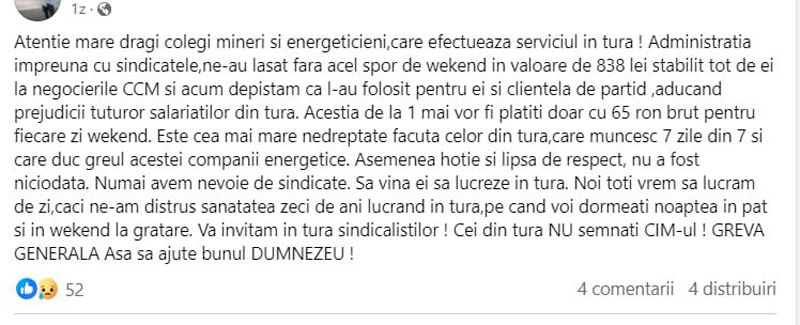 Este cea mai mare nedreptate facută celor din tură, care muncesc 7 zile din 7 și care duc greul acestei companii energetice. Asemenea hoție și lipsă de respect nu a fost niciodată. Nu mai avem nevoie de sindicate. Să vină ei sa lucreze în tură. Noi toți vrem să lucrăm zi de zi, căci ne-am distrus sănătatea zeci de ani lucrând în schimburi, pe când voi dormeați noaptea, în pat, și în weekend la grătare. Vă invităm în tură, sindicaliștilor! Cei din tură, NU semnati CIM-ul! GREVĂ GENERALĂ! Așa să ajute bunul DUMNEZEU!”, a fost mesajul unui salariat.
