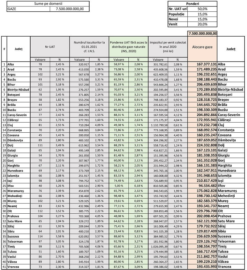„Criteriile de selectare care au fost luate în considerare la alocarea sumelor au fost numărul de unități administrativ-teritoriale dintr-un județ, numărul de locuitori, ponderea localităților (UAT) unde gospodăriile nu sunt racordate la rețeaua de distribuție a gazelor naturale și impozitul pe venit colectat”, a spus ministrul Dezvoltării.