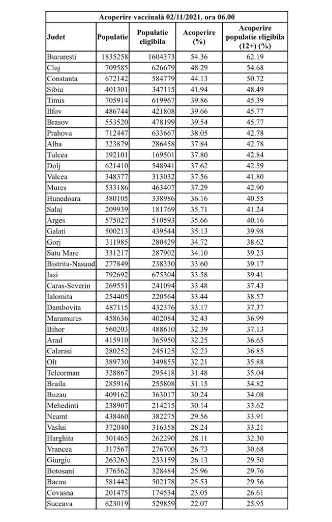 „Până la data de 1 noiembrie au fost vaccinate la nivel naţional cu cel puţin o doză peste 7.053.000 de persoane. Din acestea, peste 6,3 milioane de persoane sunt persoane vaccinate în momentul de faţă cu schemă completă. Practic, rata de acoperire vaccinală din populaţia totală a României, de peste 19,3 milioane de locuitori este de 36,5%. Însă, uitându-ne la populaţia eligibilă, peste 12 ani, această rată de acoperire vaccinală este de 42%, iar din populația adultă, peste 18 ani, rata de acoperire vaccinare este de 45%”, a precizat Valeriu Gheorghiță, coordonatorul campaniei de vaccinare.