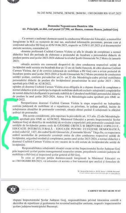 Astfel: ”Urmare a adresei nr. 245 MSI din 3 Iulie 2023 de la Ministerul Educației, ISJ Gorj a fost obligat sa reia etapa de pretransfer. Ședința a avut loc vineri 14 Iulie 2023 la sediul ISJ Gorj. Au fost prezenți insp. General Marcela Mrejeru, inspector general adjunct Marius Staicu, inspector resurse umane Andritoiu Liliana și Inspector resurse umane Prunescu Romeo. Inspectorii au menționat ca deciziile pentru mine și doamna Luminița Popa o sa fie gata marti 18 Iulie 2023. Nimic din toate acestea nu s-a întâmplat, deși de la ”Constantin Savoiu” au fost distribuite, legal de această dată, cum spuneam, mie și doamnei Luminița Popa. Mai mult, aplicația informatică a fost actualizata fără ca orele să ne fie distribuite așa cum a fost consemnat în data de 14 iulie, in procesul verbal de la ședința publică pentru etapa de pretransfer. Bătaia de joc e modul de operare al ISJ Gorj! Deciziile corecte se impunea sa fie emise la finele lunii aprilie, dacă se respecta legea!”, a declarat, astăzi, profesorul.