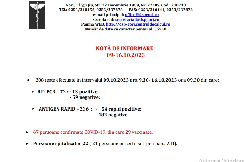 Direcţia de Sănătate Publică Gorj anunță că, în perioada 9-16 octombrie 2023, la nivelul județului au fost înregistrate 67 de cazuri confirmate cu infecția SARS-CoV 2, în urma efectuării a peste 300 de teste anti-Covid.