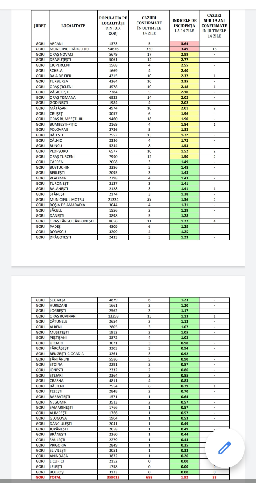 Cazurile de COVID-19 și incidența pe fiecare localitate din Gorj