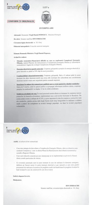 „În aceste condiții grave nu s-a găsit niciun angajat al Ministerului Energiei care să-și facă meseria și să transmită la timp informațiile solicitate pentru informarea corectă a oamenilor. Politrucii din fruntea Ministerului Energiei ar trebui să caute soluții pentru statul român și cetățenii săi, nu pentru afacerile unor căpușe ale sistemului. Vă atașez atât interpelarea depusă, cât și răspunsul Ministerului Energiei. Voi continua să solicit informații Ministerului Energiei și, dacă răspunsurile vor fi la fel de evazive și lipsite de conținut, voi solicita prezența la plen a Ministrului Energiei”, a conchis senatorul Forța Dreptei.