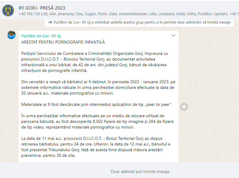 Situație fără precedent și poate unică la nivel național! IPJ Gorj a blocat orice intervenție a ziariștilor pe grupul de presă în aplicația whats app. Mai exact, a sistat posibilitatea jurnaliștilor de a pune întrebări pe grup, rămânând ca doar IPJ Gorj să-și posteze comunicatele de presă, iar ziariștii, eventual, să facă pe dactilografele. Practic, IPJ Gorj nu vrea să fie deranjat de întrebările oamenilor de presă, oricare ar fi ele.