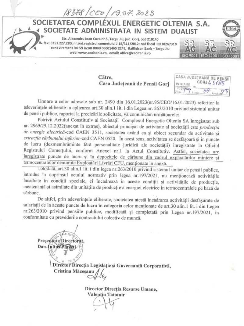Astfel, CE Oltenia a trimis casei de pensii o adresă în care, în loc să specifice clar că oamenii au lucrat în producție, a lăsat din nou loc de interpretare. În adresa cu pricina se specifică doar că CEO a avut puncte de lucru în depozitele de cărbune din cadrul exploatărilor miniere și termocentralelor, denumite Exploatări Livrări CFU.
