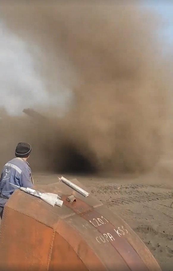 În filmuleț se vede cum a luat naștere, din senin, la o mică bătaie de vânt o tornadă de praf de cărbune și steril, și cum se plimbă aceasta purtată de vânt măturând solul în jurul ei și crescând în intensitate.