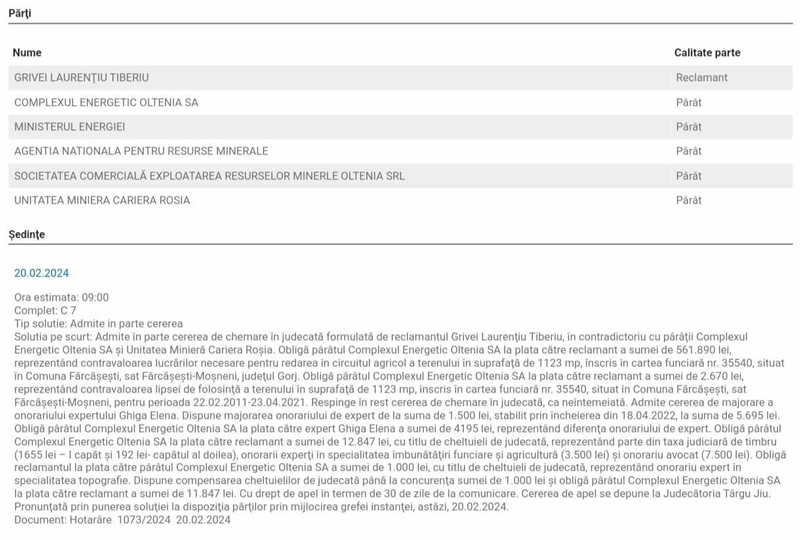 Obligă pârâtul Complexul Energetic Oltenia SA la plata către reclamant a sumei de 2.670 lei, reprezentând contravaloarea lipsei de folosinţă a terenului în suprafaţă de 1123 mp, înscris în cartea funciară nr. 35540, situat în Comuna Fărcăşeşti, sat Fărcăşeşti-Moşneni, pentru perioada 22.02.2011-23.04.2021. (…) Obligă pârâtul Complexul Energetic Oltenia SA la plata către reclamant a sumei de 12.847 lei, cu titlu de cheltuieli de judecată, reprezentând parte din taxa judiciară de timbru (1655 lei – I capăt şi 192 lei- capătul al doilea), onorarii experţi în specialitatea îmbunătăţiri funciare şi agricultură (3.500 lei) şi onorariu avocat (7.500 lei). (…) Dispune compensarea cheltuielilor de judecată până la concurenţa sumei de 1.000 lei şi obligă pârâtul Complexul Energetic Oltenia SA la plata către reclamant a sumei de 11.847 lei”, se arată în sentința dată de Judecătoria Târgu Jiu pe 20 februarie 2024.