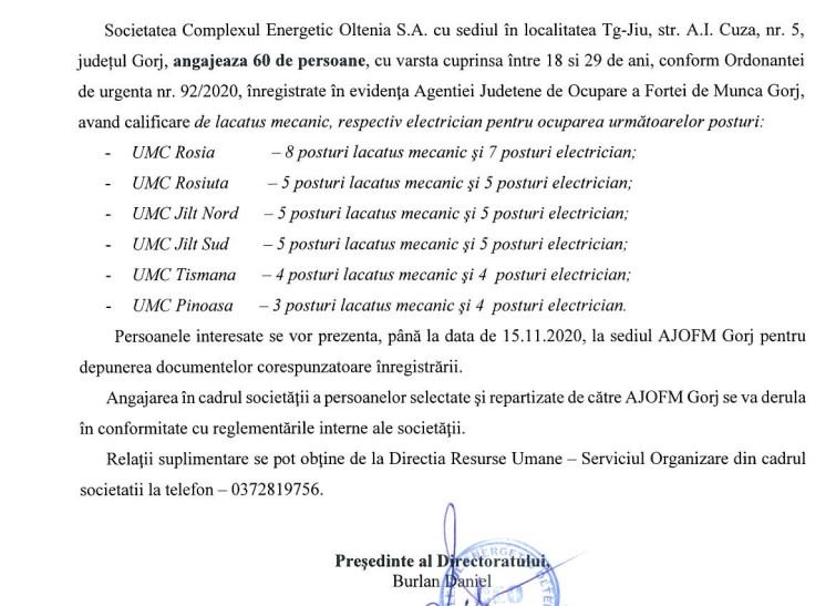 Posturile sunt vacante în carierele Roșia, Roșiuța, Jilț Nord, Jilț Sud, Tismana și Pinoasa. „Persoanele interesate se vor prezenta, până la data de 15 noiembrie, la sediul AJOFM Gorj, pentru depunerea documentelor corespunzătoare înregistrării. Angajarea în cadrul societății a persoanelor selectate și repartizate de către AJOFM Gorj se va derula în conformitate cu reglementările interne ale societății. Relații suplimentare se pot obține de la Direcția Resurse Umane – Serviciul Organizare”, a comunicat Complexul Energetic Oltenia.