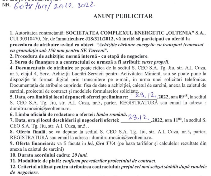 Iată că în anunțul de achiziție de lignit, șefii CEO ascund prețul pe care compania îl va plăti pentru cărbunele de care are nevoie, dar și cantitatea necesară, făcând trimitere la caietul de sarcini. Secretomania pare să se fi instalat de-a binelea în ultimii ani la CEO, administrația ascunzând și anexele convocatoarelor aferente ședințelor ordinare și extraordinare ale acționarilor societății de stat, deși acestea ar fi trebuit să fie publice.