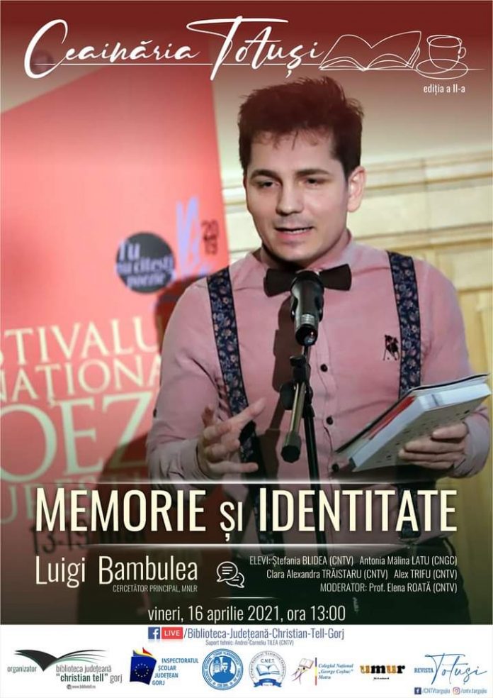Colegiul Național „Tudor Vladimirescu”, în parteneriat cu Biblioteca Județeană „Christian Tell”, Inspectoratul Școlar Județean Gorj, Colegiul Național „Ecaterina Teodoroiu” și Colegiul Național „George Coșbuc” Motru, organizează în data de 16 aprilie 2021, ora 13:00, a II-a ediție a Ceainăriei culturale „Totuși”. „Invitatul nostru este domnul Luigi Bambulea, cercetător principal în cadrul Muzeului Național al Literaturii Române, o prezență care, prin preocupările sale, onorează, de fiecare dată, spațiul întâlnirilor dialogale în căutarea cărora se află mereu adolescenții. Evenimentul va fi transmis live pe pagina de facebook a Bibliotecii Județene „Christian Tell””, au anunțat organizatorii.