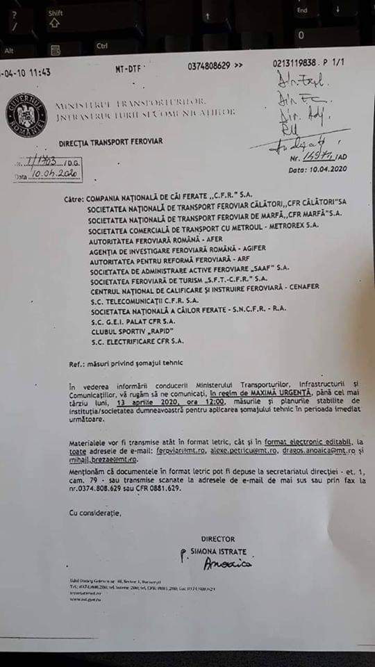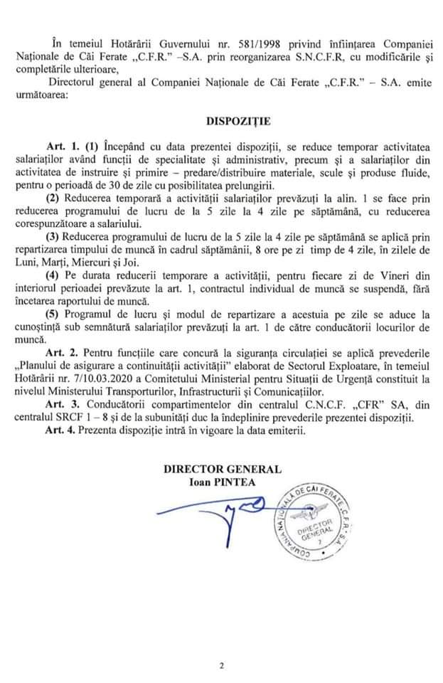 SNCFR a luat măsuri de reducere a timpului de lucru pentru angajații din căi ferate. Ceferiștii gorjeni spun că printr-o dispoziție a directorului general, timpul de lucru s-a redus la 4 zile pe săptămână, din 5 zile. Măsura a atras după sine o reducere a salariului. Aceasta se aplică din 18 martie și are o valabilitate de 30 de zile.