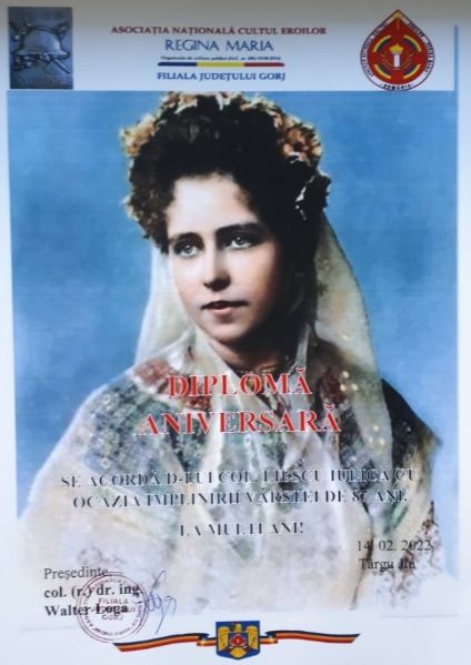 Luni, 14 februarie 2022, domnul col. (rtr.) Iulică Gr. LIESU, cel mai tânăr locotenent din Armata Română, la doar 18 ani (5 martie 1953), membru al A.N.C.E. „Regina Maria” – Filiala Județului Gorj „Tudor Vladimirescu” și al ANCMRR „Alexandru Ioan Cuza” – Filiala Județului Gorj „General Ioan Culcer”, a împlinit 87 ani de viață.