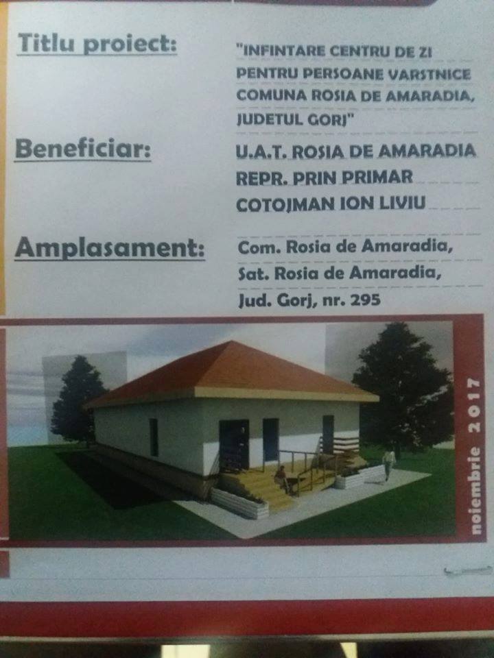„Au început lucrările pentru înființarea centrului de zi pentru persoane vârstnice din comuna Roșia de Amaradia, centru ce va fi dotat și cu aparatură telemedicală. Finanțarea este asigurată de la Uniunea Europeană. Investiția presupune reabilitarea și dotarea fostei brutării din Roșia de Amaradia, clădire ce se află în stadiu avansat de degradare, pe care Primăria Roșia de Amaradia a achiziționat-o cu suma de 4.000 de lei, de la un lichidator”, a anunțat primarul Ion Liviu Cotojman. Centrul pentru bătrâni va fi gata în 2020.
