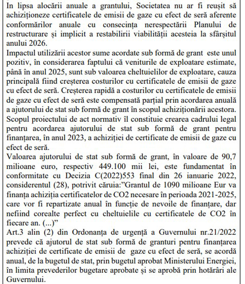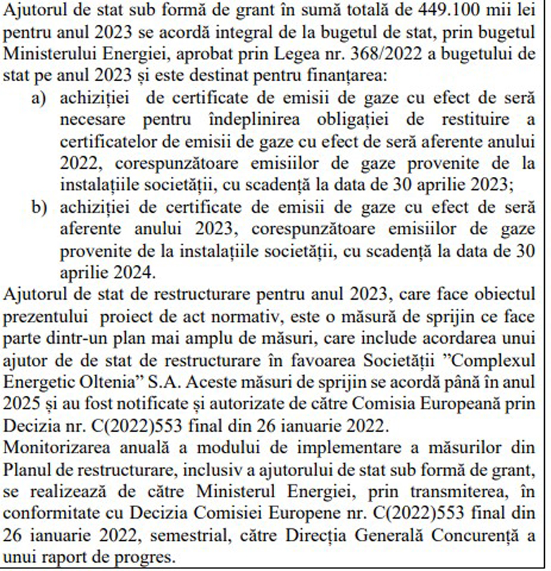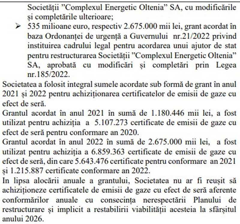 Astfel, Complexul Energetic Oltenia trebuie să primească subvenții de 848,6 milioane euro pentru achiziția de certificate CO2 până în 2025 inclusiv, din care 535 milioane euro în 2022 și 90,7 milioane de euro în acest an. Hotărârea se află de ieri în Transparență Decizională, pe site-ul Ministerului Energiei și privește aprobarea acordării ajutorului de stat pentru restructurare sub formă de grant în favoarea Societății ,,Complexul Energetic Oltenia” S.A. în scopul finanțării cheltuielilor cu certificatele de gaze cu emisii de efect de seră, pentru anul 2023 CEO trebuie să aibă achiziționat, până la data de 30 aprilie a fiecărui an, numărul de certificate de emisii de gaze cu efect de seră egal cu cantitatea totală de emisii de gaze cu efect de seră emise în cursul anului precedent.