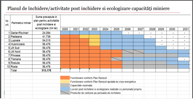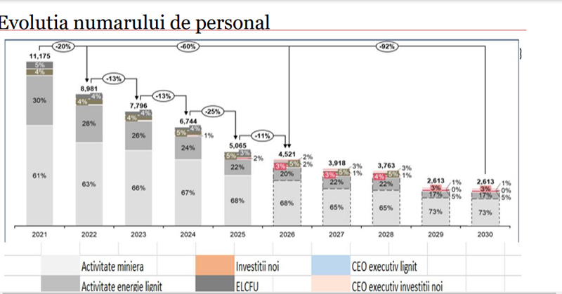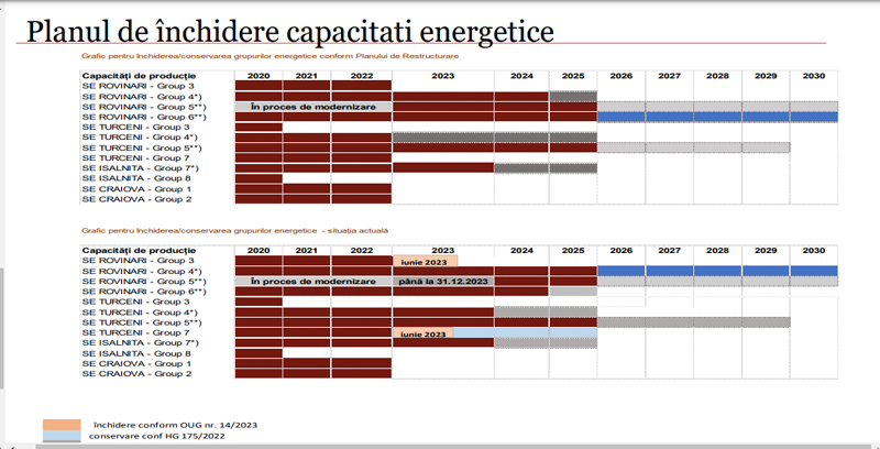 Planul de restructurare revizuit a fost publicat ieri pe site-ul Complexului Energetic Oltenia. Astfel, în acest an vor rămâne 7.796 salariați, numărul angajaților scăzând anual cu aproximativ 1.000 până în anul 2.030, când compania va avea 2.613 angajați. Până în 2025 inclusiv, vor funcționa doar carierele Jilț Nord, Pinoasa, Roșia și Roșiuța, iar până în 2030, din cele patru, vor rămâne în capacitate rezervată doar Pinoasa și Roșia. În graficul de închidere a grupurilor energetice apare Rovinari cu grupurile 4 și 5, care vor rămâne până în 2025 inclusiv, și Turceni, cu grupul 5. Ele vor trece în rezervă de capacitate din 2026.