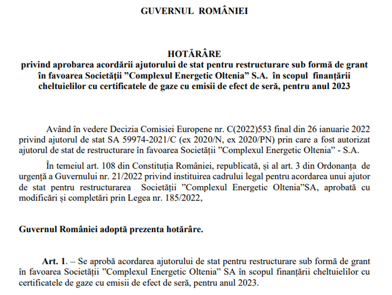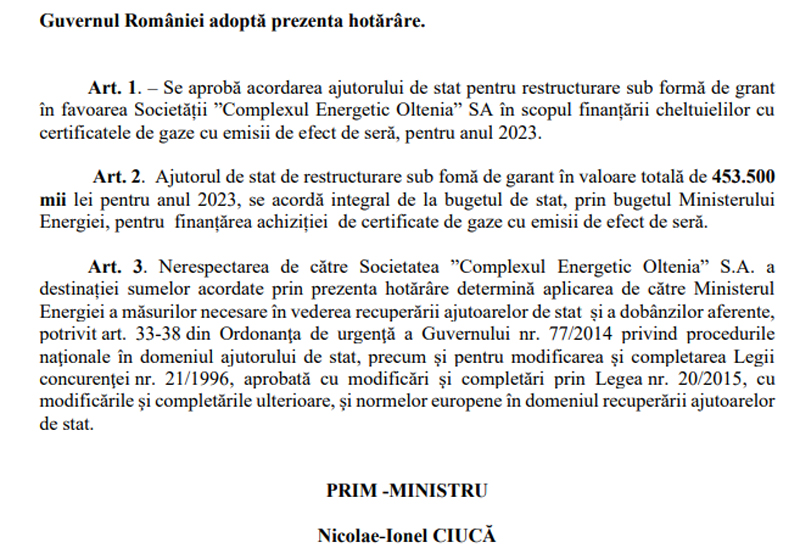 Ministerul Energiei a pus, pentru consultare publică, hotărârea de guvern privind aprobarea acordării ajutorului de stat CE Oltenia. Acesta este în sumă totală de 453.500 mii lei pentru anul 2023 și se acordă integral de la bugetul de stat, prin bugetul Ministerului Energiei, aprobat prin Legea nr.368/2022 a bugetului de stat pe anul 2023.