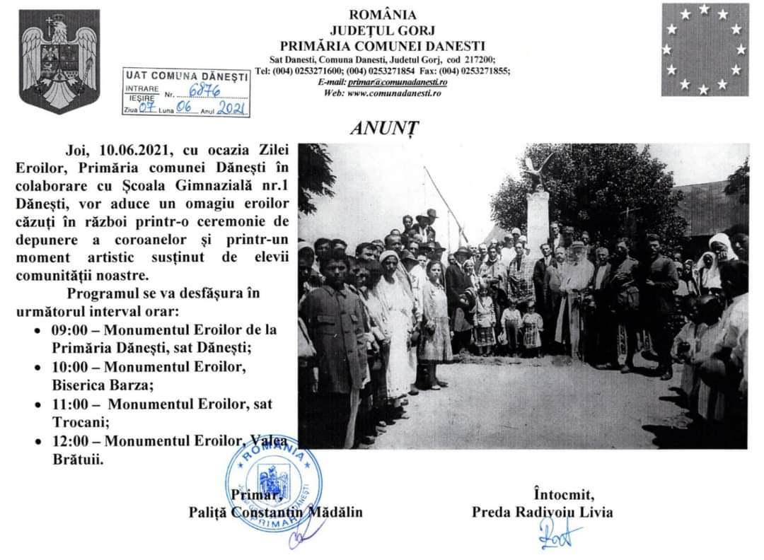 Ceremonie de omagiere a eroilor, mâine, la Dănești