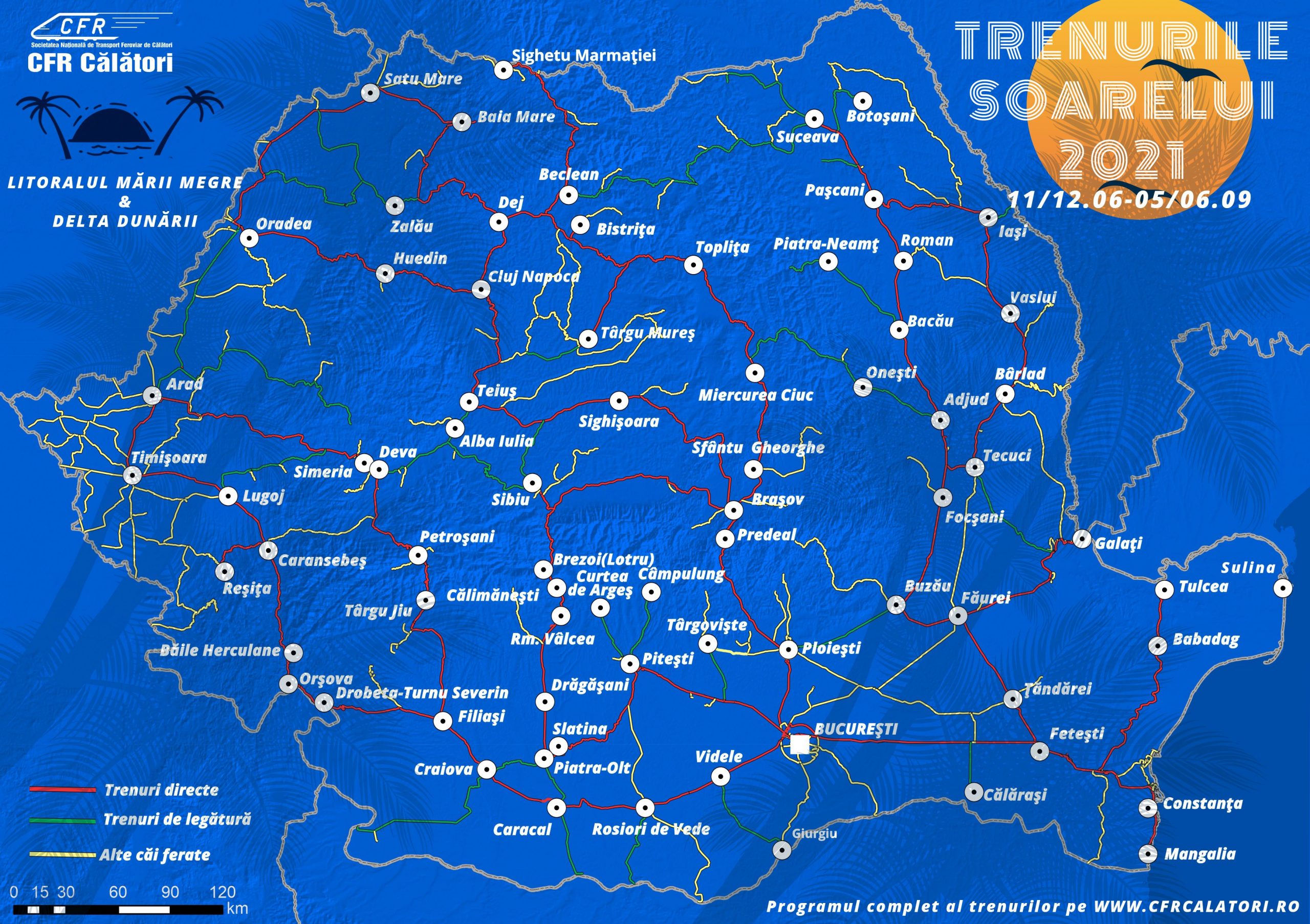 CFR Călători informează că, începând cu data de 11/12 iunie 2021, va lansa programul estival de transport “Trenurile Soarelui”. Până la data de 5/6 septembrie, turiștii vor avea la dispoziție 40 de trenuri ce vor asigura zilnic legături directe din toată țara cu staţiunile de la Marea Neagră și cu Delta Dunării.