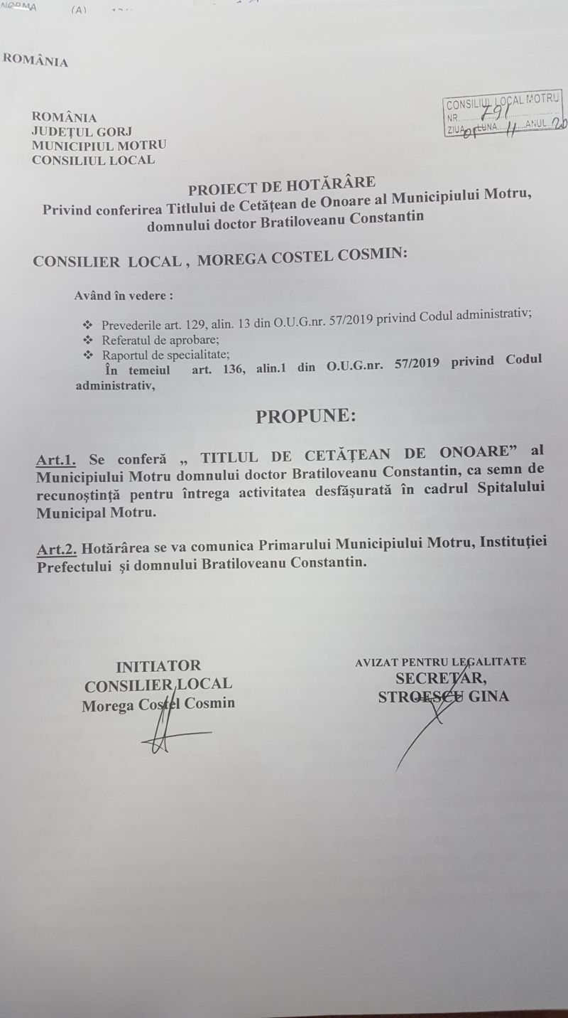În ședința de CL Motru din această săptămână, pe ordinea de zi, se va afla și un proiect prin care se propune ca dr. chirurg Constantin Bratiloveanu, care de-a lungul carierei sale profesionale a salvat nenumărate vieți, să-i fie conferit titlul de cetățean de onoare al municipiului. Medicul s-a pensionat în urmă cu aproximativ doi ani, ultimul său loc de muncă fiind spitalul orășenesc din Motru. Propunerea a fost făcută de viceprimarul PSD, Cosmin Morega, ce consideră că medicul este o personalitate complexă, trăsături morale care atestă că în întreaga sa carieră a fost responsabil nu numai profesional, ci și în relațiile cu semenii săi. Aceasta este prima propunere de acest gen în mandatul actualului Consiliu Local ales în 2016.