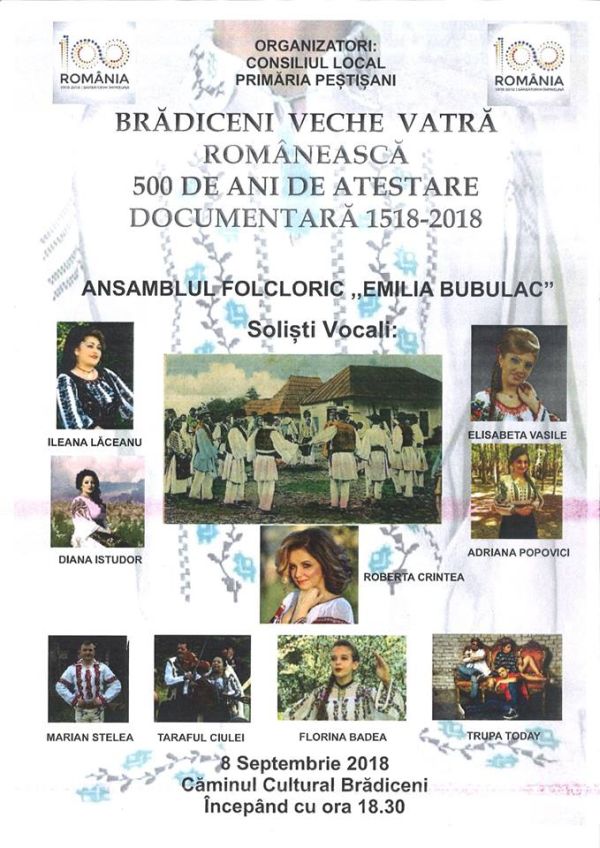 Sub titulatura “Brădiceni veche vatră românească-500 de ani de atestare documentară 1518-2018”, pe scenă vor urca începând cu ora 18.30, artiştii Ileana Lăceanu, Diana Istudor, Elisabeta Vasile, Roberta Crintea, Adriana Popovici, Marian Stelea, Taraful Ciulei, Florin Badea, precum şi trupa Today. De la manifestări nu va lipsi nici Ansamblul Folcloric “Emilia Bubulac” din Peştişani. Organizatorii evenimentului sunt Primăria și Consiliul Local Peștișani. “Sărbătorim o localitate cu foarte multă istorie, care a dat mari oameni acestei ţări. În urmă cu 300 de ani era târg. A fost capitală de plasă. Plasa avea 17 comune arondate. Era cum este Târgu Jiu pentru Gorj. Şi târgurile de atunci, în înscrisurile austriece, este trecut ca şi burg, ceea ce înseamnă oraş. Trebuie să plătim tributul care se cuvine şi comunităţii din Brădiceni pentru însemnătatea ei”, a declarat Cosmin Pigui, primarul comunei Peştişani.