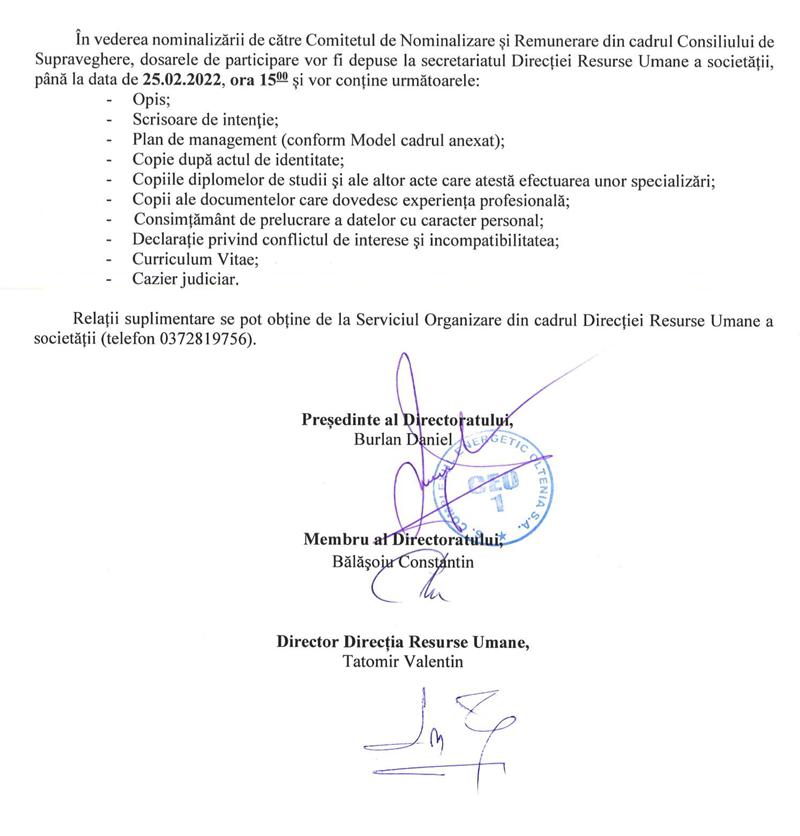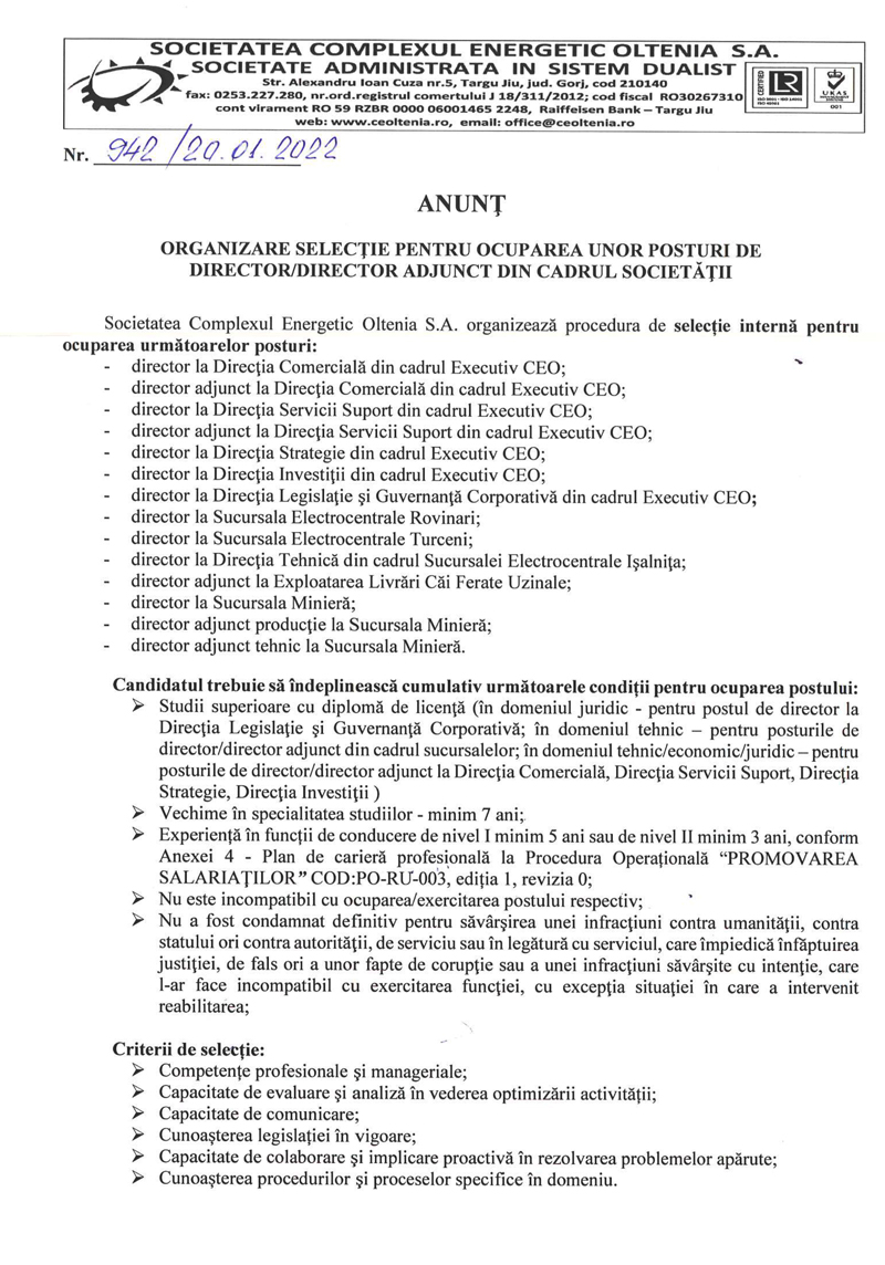 CE Oltenia a anunțat, pe 20 ianuarie a.c., organizarea selecției pentru ocuparea posturilor de director și director adjunct la Direcția Comercială, director și director adjunct la Direcția de Servicii Suport, director la Direcția de Strategie, director al Direcției de Investiții, director la Direcția Legislație, precum și pentru posturile de directori ai Sucursalelor Electrocentrale Rovinari și Turceni, dar și pentru toate cele trei poziții de conducere ale Sucursalei Miniere, adică director, director tehnic și director de producție. Printre acestea se mai regăsesc posturile de director adjunct al ELCFU, respectiv director al Direcției Tehnice din cadrul SE Ișalnița. Direcția Comercială e condusă, în prezent de către Emil Dragomirescu, care, cel mai probabil va rămâne la conducerea acestei structure cu un alt liberal în postul de director adjunct. La direcția Servicii Suport, atât directorul Ion Dragu, cât și adjunctul său, Gore Popescu, ar putea fi înlocuiți, conform unor surse din companie. La Direcția Strategie, Sorin Alecu ar putea să-și mențină funcția de director, fiind susținut de un membru al Directoratului, cu trecere în Ministerul Energiei, însă la Investiții, Ion Petroniu nu are susținere politică și la adresa activității sale există unele reproșuri care s-au acutizat, în ultima perioadă, susțin sursele citate. La Direcția Legislație, actuala directoare, Cristina Măceșanu, nu îndeplinește condițiile pentru participarea la selecție. La conducerea termocentralelor Rovinari și Turceni, conduce acum de Iosif Chircă și Viorel Filip e bătălie mare, mai ales că, în cazul în care la jumătatea lunii februarie nu i se va mai prelungi mandatul de membru al Directoratului lui Constantin Bălășoiu, cel mai probabil va conduce una din cele două termocentrale și, în acest caz, cei din PSD vor trebui să se mulțumească doar cu una. Și la Sucursala Minieră sunt disputate posturile, însă liberalii sunt în postura de a alege între actualul director, Florentin Gheorghescu și șeful carierei Roșia, Cosmin Trufelea, în contextual în care social-democrații își vor pune omul în poziția de director tehnic, funcție dorită de Ion Mogoș, fostul șef de la Roșia, în timp ce director de producție va rămâne Florin Vas, cu susținerea PNL.