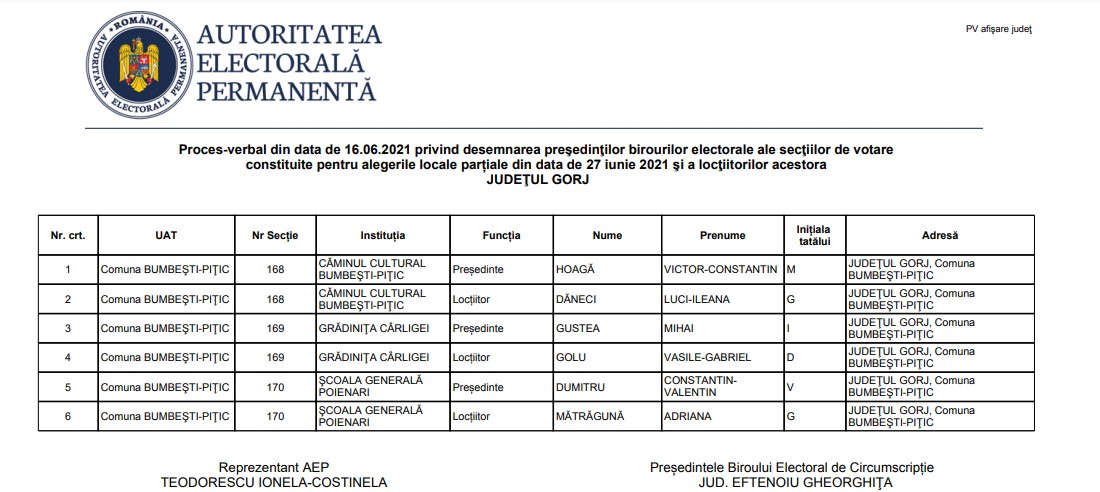 Cine sunt șefii secțiilor de votare din Bumbești-Pițic