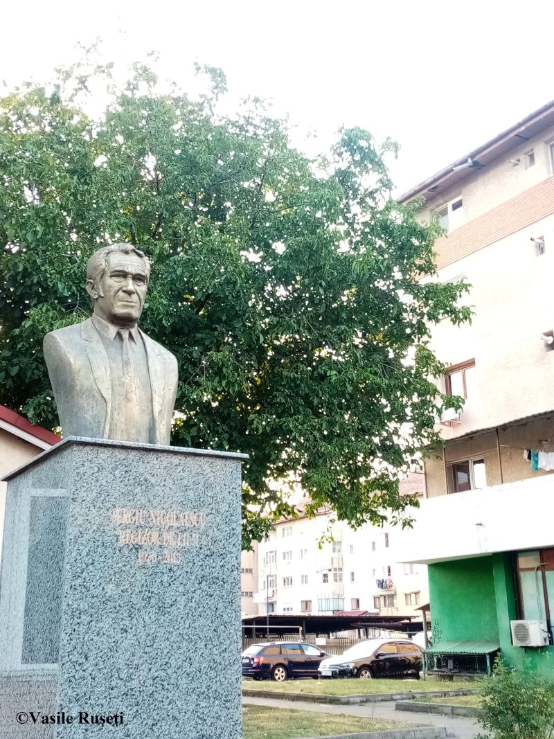 În schimbul acestor merite, orașul său natal, Târgu Jiu, i-a dedicat o statuie din bronz, aflată printre blocuri, la câțiva metri distanță, dispusă ilogic şi discutabilă din multe puncte de vedere. În opinia sculptorului craiovean Rodion Gheorghiță, care a realizat-o, asemănarea bustului cu omul Sergiu Nicolaescu are o mai mică importanță deoarece “eu nu spun că seamănă, ci că reprezintă personalitatea lui Sergiu Nicolaescu”. Dezvelirea bustului a fost făcută pe 6 noiembrie 2012, la un an după ce i s-a decernat lui Sergiu Nicolaescu şi titlul de “Cetățean de Onoare” al municipiului Târgu Jiu. Autorul bustului său sculptat susține că a folosit în sculptura respectivă fotografii din tinerețea lui Sergiu Nicolaescu, ceea ce ar explica diferența (mare, zicem noi) de fizionomie…