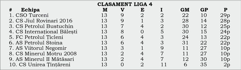 Runda cu numărul 13 din liga a patra gorjeană a programat noi dueluri echilibrate. După doi paşi greşiţi, CSO Turceni s-a impus la limită în această etapă în faţa Petrolului Stoina şi se menţine pe primul loc. Jiul Rovinari îi suflă în ceafă liderului după succesul cu Băleşti, iar Petrolul Bustuchin este pe podium în ciuda unei remize la Țicleni. Cel mai spectaculos meci de la ,,Onoare” s-a disputat la Roşia de Amaradia şi a avut 9 goluri. Unirea Dragoteşti conduce liga a cincea din Gorj, dar alte patru echipe stau la pândă.