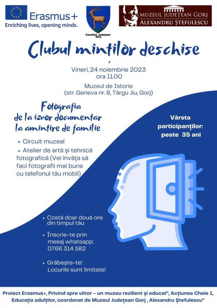 Participarea este gratuită, iar înscrierea se face prin mesaj WhatsApp, la numărul de telefon 0766.314.582. Programul face parte din proiectului Erasmus+ ”Privind spre viitor – un muzeu rezilient și educat”, din cadrul Acțiunii cheie 1, Educația adulților, coordonat de Muzeul Județean Gorj „Alexandru Ștefulescu”.