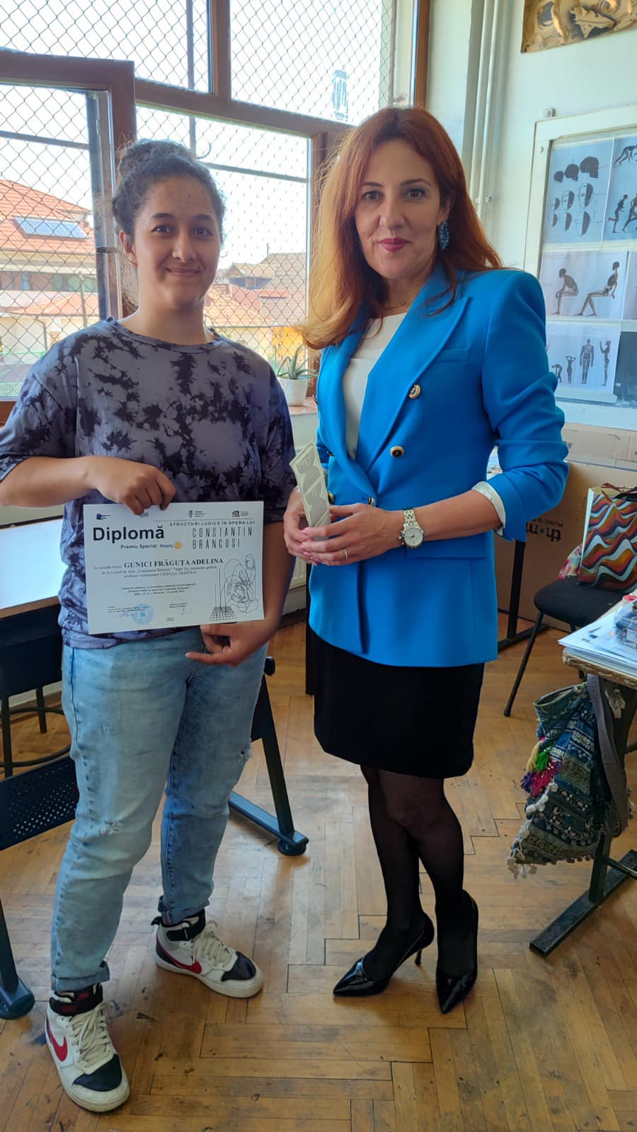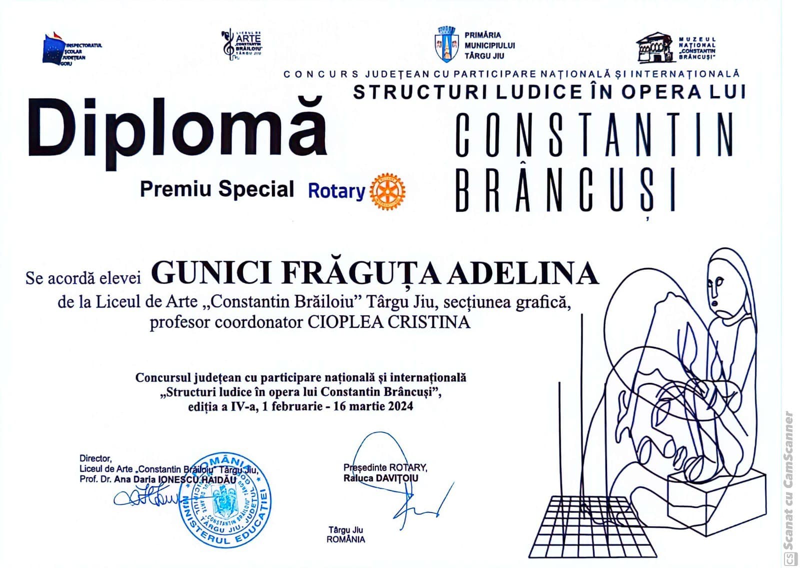 Diploma a fost înmânată de președintele Rotary Târgu Jiu, Raluca Davițoiu, elevei Frăguța Elena Gunici de la Liceul de Arte ”Constantin Brăiloiu”, profesor coordonator Cristina Cioplea. Concursul a fost organizat de Inspectoratul Școlar Județean Gorj, Liceul de Arte ”Constantin Brăiloiu” Târgu Jiu, Primăria Municipiului Târgu Jiu și Muzeul Național ”Constantin Brâncuși” și s-a bucurat de participare națională și internațională.
