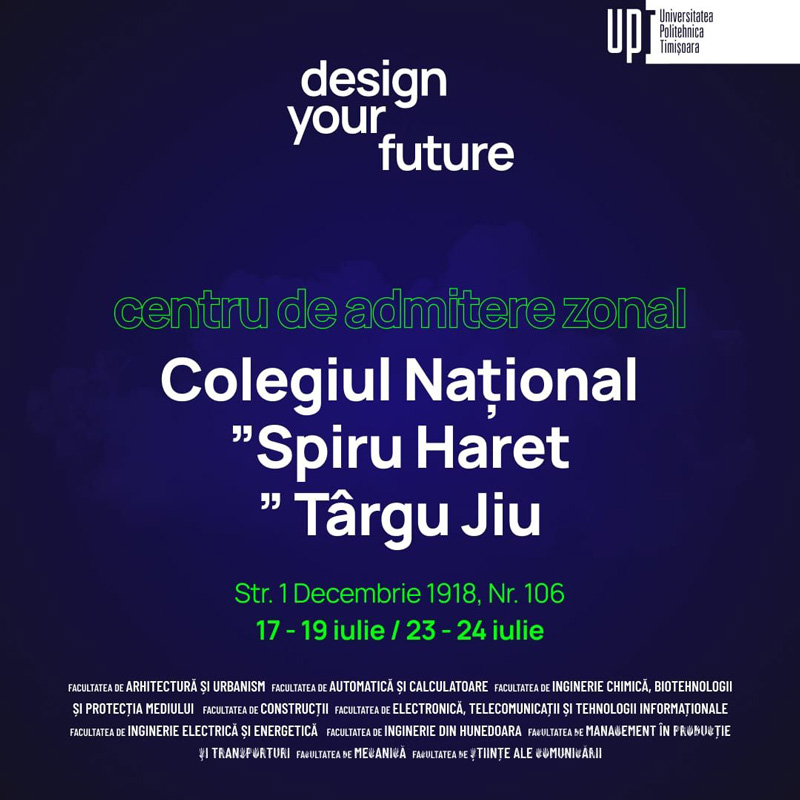 Colegiul Național ,,Spiru Haret” Târgu Jiu devine centru zonal de admitere la Universitatea Politehnica Timișoara, au anunțat reprezentanții unității de învățământ superior din Banat: ,,Ți-ai pregătit dosarul de admitere? Universitatea Politehnica Timișoara vine chiar la tine acasă, în Târgu Jiu. Centrul de admitere UPT de la Colegiul Național ,,Spiru Haret”, str. 1 Decembrie 1918, nr. 106, este deschis în perioadele: 17–19 iulie (09:00 – 16:00); 23–24 iulie (09:00 – 14:00). Alege-ți rolul la una dintre facultățile UPT și scrie-ți propriul scenariu de succes: Facultatea de Arhitectură și Urbanism; Facultatea de Automatică și Calculatoare; Facultatea de Inginerie Chimică, Biotehnologii și Protecția Mediului; Facultatea de Construcții; Facultatea de Electronică, Telecomunicații și Tehnologii Informaționale; Facultatea de Inginerie din Hunedoara; Facultatea de Inginerie Electrică și Energetică; Facultatea de Management în Producție și Transporturi; Facultatea de Mecanică; Facultatea de Științe ale Comunicării”.