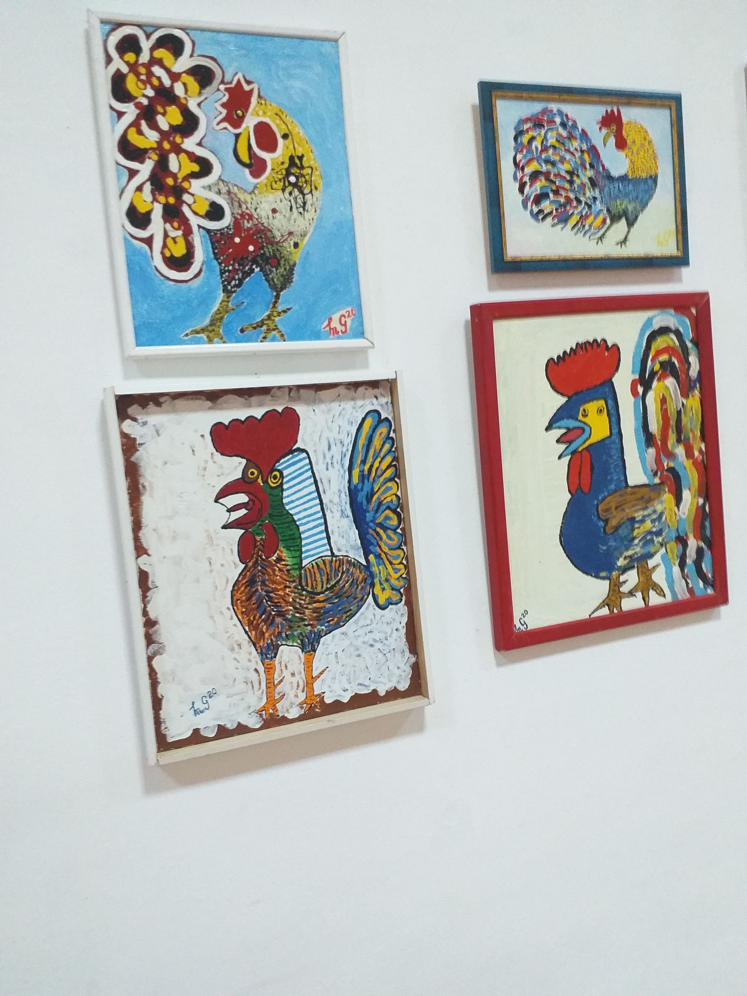 În curând putem asista la un protest al literelor care, devenite cuvinte, par a se fi golite deodată de conținut. Total? Parțial? Și pentru că un segment de public (oameni de fotbal) pare interesat de această exprimare artistică a scriitorului, recompensându-i munca prin remunerarea operelor achiziționate, credem că Marius Ghica va merge mai departe pe drumul culorii. Acestea fiind zise și convinși fiind că tablouri cu cocoși vesel colorați vor umple pereții locuințelor, poate și în locul, ,,Covorului Oltenesc” să îl amintim pe I.D. Sîrbu cel adorat de scriitorul craiovean, (nu din Isarlâc ?). Prin cuvinte poți ,,traduce” un tablou, dar nu poți face un tablou din cuvinte. Tablourile lui Marius Ghica nu au un sens adânc, nici peiorativ, nici aluziv, nici subteran. Sunt cocoși, și nefiind vorba doar de sindromul „Violon d’Ingres”, am avea o singură observație: cocoși, cocoși, …dar nu putea să fie și o găinușă ?
