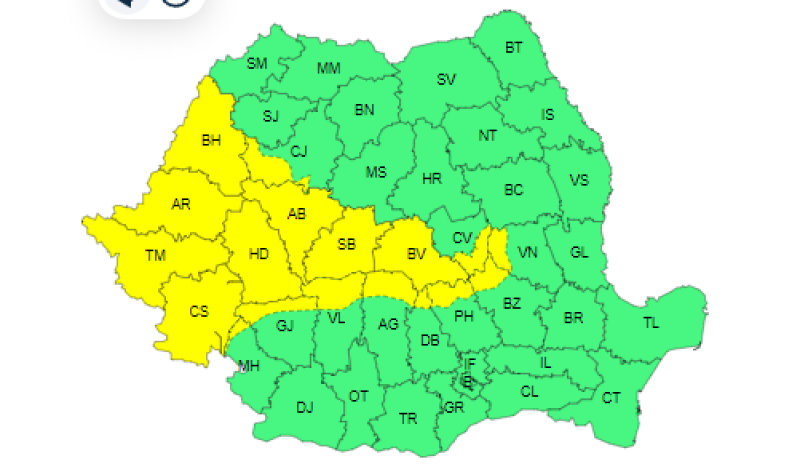 Potrivit ANM, sunt vizate, integral sau parțial, județele Bihor, Arad, Timiș, Caraș-Severin, Cluj, Alba, Hunedoara, Sibiu, Brașov, Covasna, Vrancea, Buzău, Prahova, Dâmbovița, Argeș, Vâlcea, Gorj și Mehedinți.