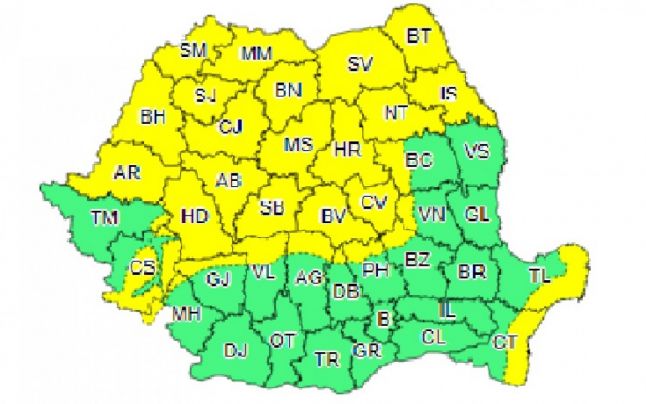 Meteorologii au emis o avertizare cod galben de vânt puternic, valabilă sâmbătă, în 31 de judeţe din întreaga ţară. Vântul va sufla cu până la 80 de kilometri la oră în zonele joase şi cu 100 de kilometri la oră la munte.