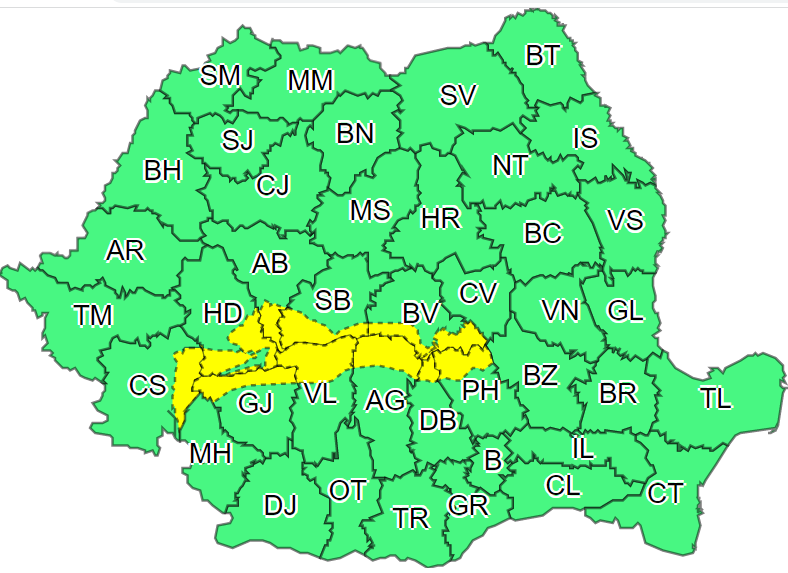 Administraţia Naţională de Meteorologie (ANM) a emis o atenţionare Cod galben de vânt şi ninsoare viscolită, valabilă până luni dimineaţa în zonele de munte din mai multe județe, inclusiv Gorj.