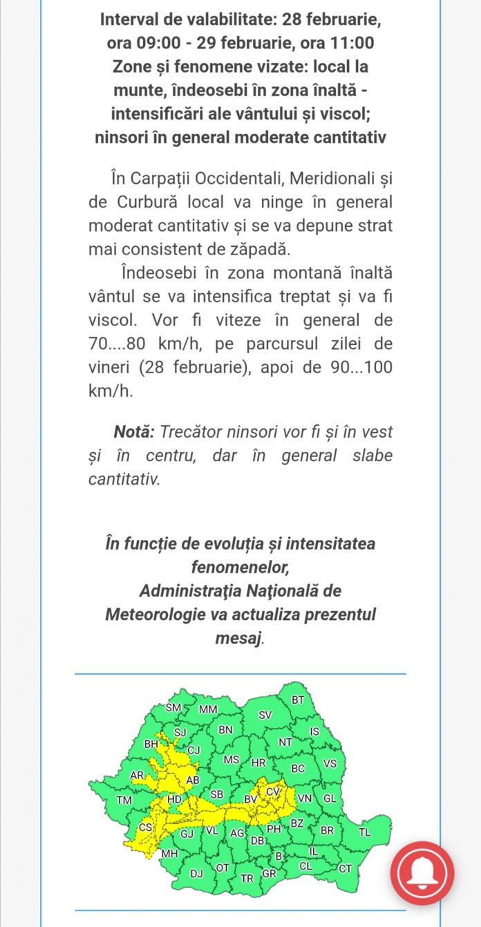 Cod galben până mâine la 11:00 pentru nordul Gorjului