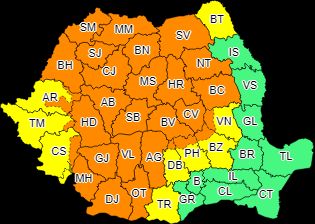 Avertizarea de cod portocaliu este valabilă până diseară la ora 22.00. Vijelii puternice și ploi abundente vor fi în zonele de munte, în Maramureș, Transilvania, Oltenia, nord-vestul Munteniei și local în Moldova, iar spre seară și în Crișana vor fi vijelii puternice, cu rafale de peste 70 – 80 km/h, ploi torențiale, frecvente descărcări electrice și grindină. În intervale scurte de timp sau prin acumulare cantitățile de apă vor depăși local 35-40 și izolat 50-60 l/mp.