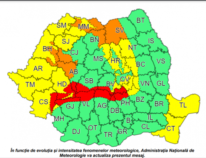 Meteorologii au emis coduri galben, portocoliu și roșu pentru zonele în care vor avea loc ploi și vijelii. Gorjul și alte județe sunt sub cod roșu de viscol puternic la munte, cu rafale ale vântului de peste 120, 140 km/h.