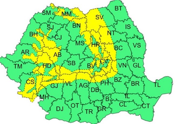 Până în această seară, la ora 20.00, se menţine atenţionarea Cod galben de vânt puternic şi ninsori în toată zona de munte a ţării. Vântul va prezenta intensificări, în general cu viteze de 65…80 km/h si temporar va ninge. Ninsorile vor fi mai intense în special în Carpații Occidentali, vestul Carpaților Meridionali și nordul Carpaților Orientali, unde local se vor acumula cantități de 10…15 l/mp.