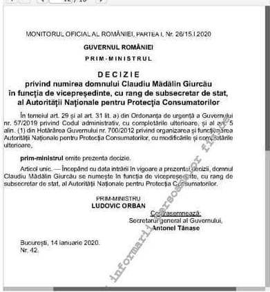 Comisarul Milosteanu își va intra în atribuții de astăzi după ce fostul său șef, Mădălin Giurcău, a fost promovat vicepreședinte al Autorității Naționale pentru Protecția Consumatorului, funcție cu rang de subsecretar de stat. Decizia de numire a lui Giurcău, care conduce din 2011 instituția de la Gorj, a fost semnată pe 14 ianuarie de premierul Orban, și publicată a doua zi în Monitorul Oficial.