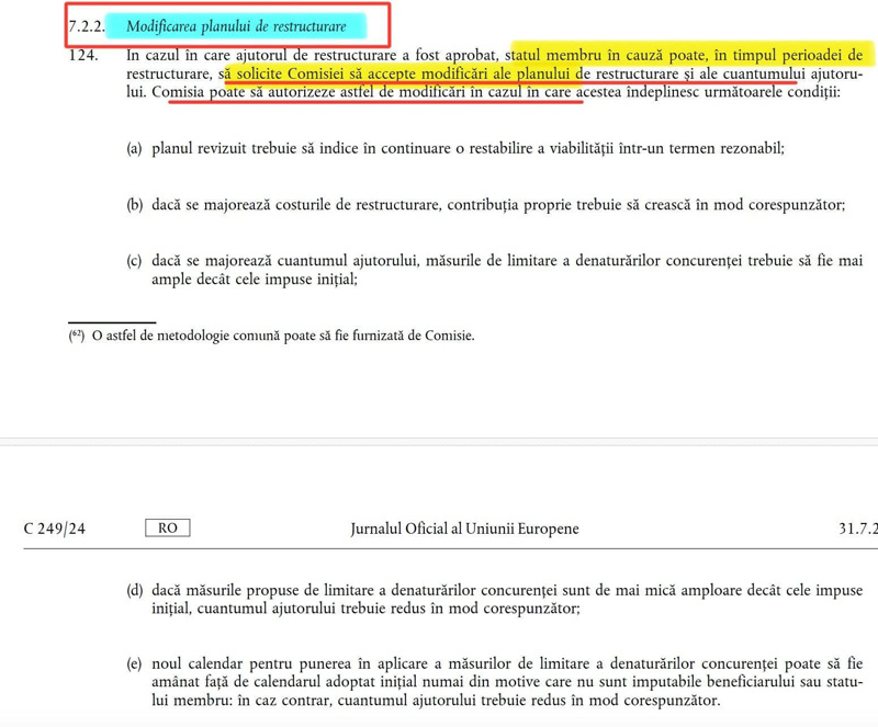 În Jurnalul Oficial al Uniunii Europene este prevăzut, negru pe alb, că în cazul în care un stat membru vrea să aducă o modificare în planurile inițiale de restructurare a companiilor de stat, are această permisiune, cu îndeplinirea unor condiții.