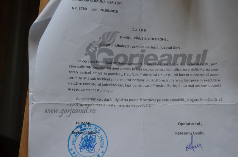 Șocant este că fosta conducere a Primăriei Berlești îl anunța pe proprietar că are în 2014, 9635 de mp, ca apoi în 2016, aceeași instituție să releve că proprietarul are 9154 de mp. Membrii Comisiei de Fond Funciar din Berlești beneficiază de spor de 50% din salariul de bază pentru că fac parte din acest organism. Adresa transmisă în 26 septembrie 2016 lui Gheorghe Păiuș arată însă că respectiva comisie își face treaba după poftele membrilor săi, omul fiind informat atunci că această comisie nu vrea să se deplaseze în teren.