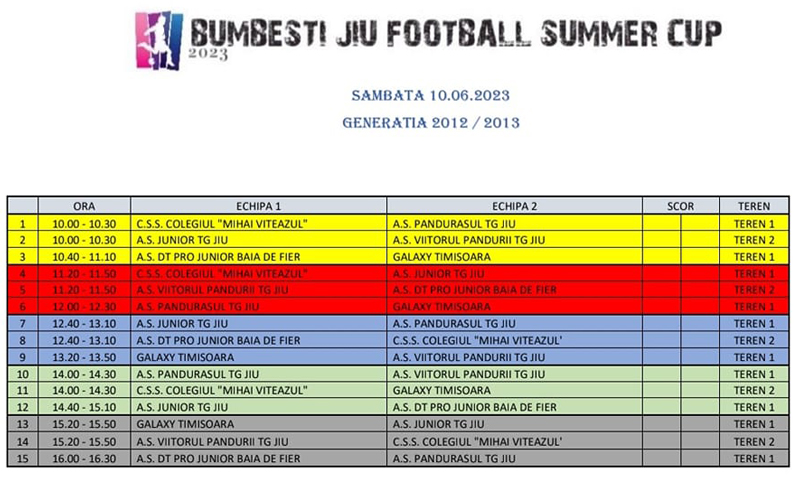 Stadionul ,,Aurel Țicleanu” din Bumbești Jiu va fi, în weekend, gazda primei ediții a „Bumbești Jiu Football Summer Cup”. Șase echipe vor participa la competiția juvenilă, care este organizată în perioada Zilelor Orașului. Turneul de minifotbal se va desfășura sâmbătă, 10 iunie, pe două terenuri de iarbă și adună la start formațiile CSS Colegiul Mihai Viteazul, AS Pandurașul Târgu Jiu, AS Junior Târgu Jiu, AS Viitorul Pandurii Târgu Jiu, AS DT Pro Junior Baia de Fier și Galaxy Timișoara. Aproximativ 100 de micuți vor disputa 15 meciuri. Organizatorii speră ca acest turneu să fie începutul unei lungi tradiții pentru comunitatea din care fac parte.